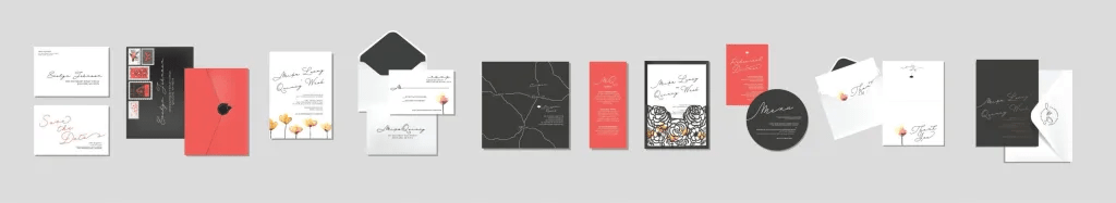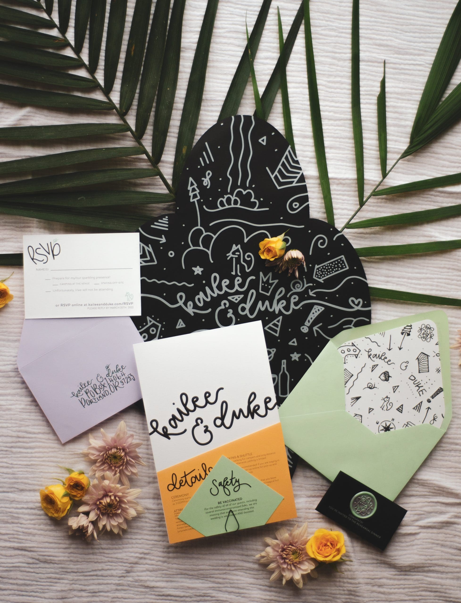This covers your art direction and the designs for: invitation, RSVP, & detail card.